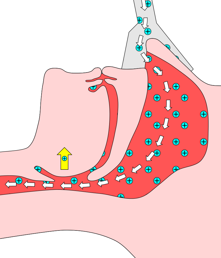Die Illustrationen (Quelle: Wikimedia) zeigen von links nach rechts den normalen Atemfluss, die Blockade bei Schlafapnoe und die Öffnung der Atemwege durch die CPAP-Therapie: